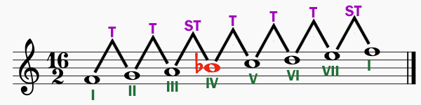 Escala diatônica maior com bemol – Fá Maior. III Grau (Si) foi abaixado pra manter distância intervalar padrão.