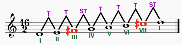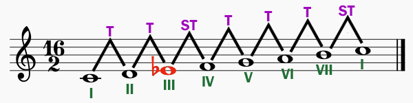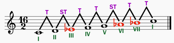 Notas indicadas por graus em algarismos romanos de I a VII. Distâncias intervalares de tom (T) e semitom (ST)