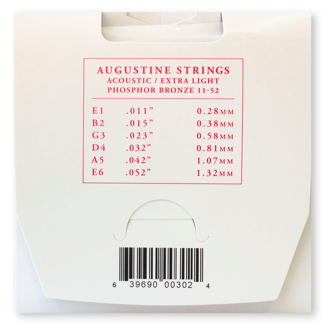 Conteúdo da embalagem: 1 (um) jogo completo de 6 (seis) cordas para violão aço, Augustine Acoustic Extra Light 011″ (.011″-.052″)