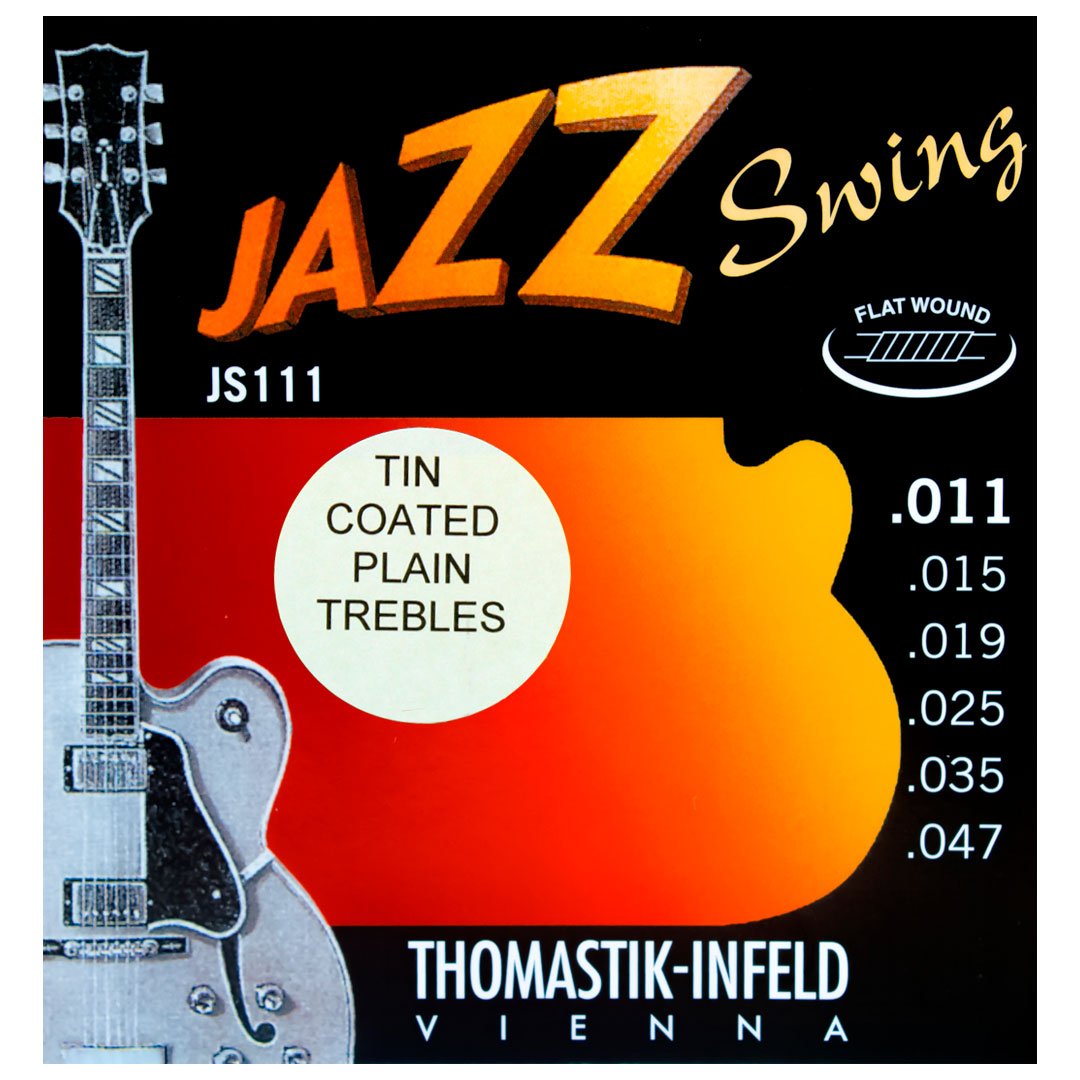 O modelo Thomastik – Infeld Jazz Swing JS111T (0,011”) é tin plated – as primas E e B são de aço sólido e recebem banho de estanho.
